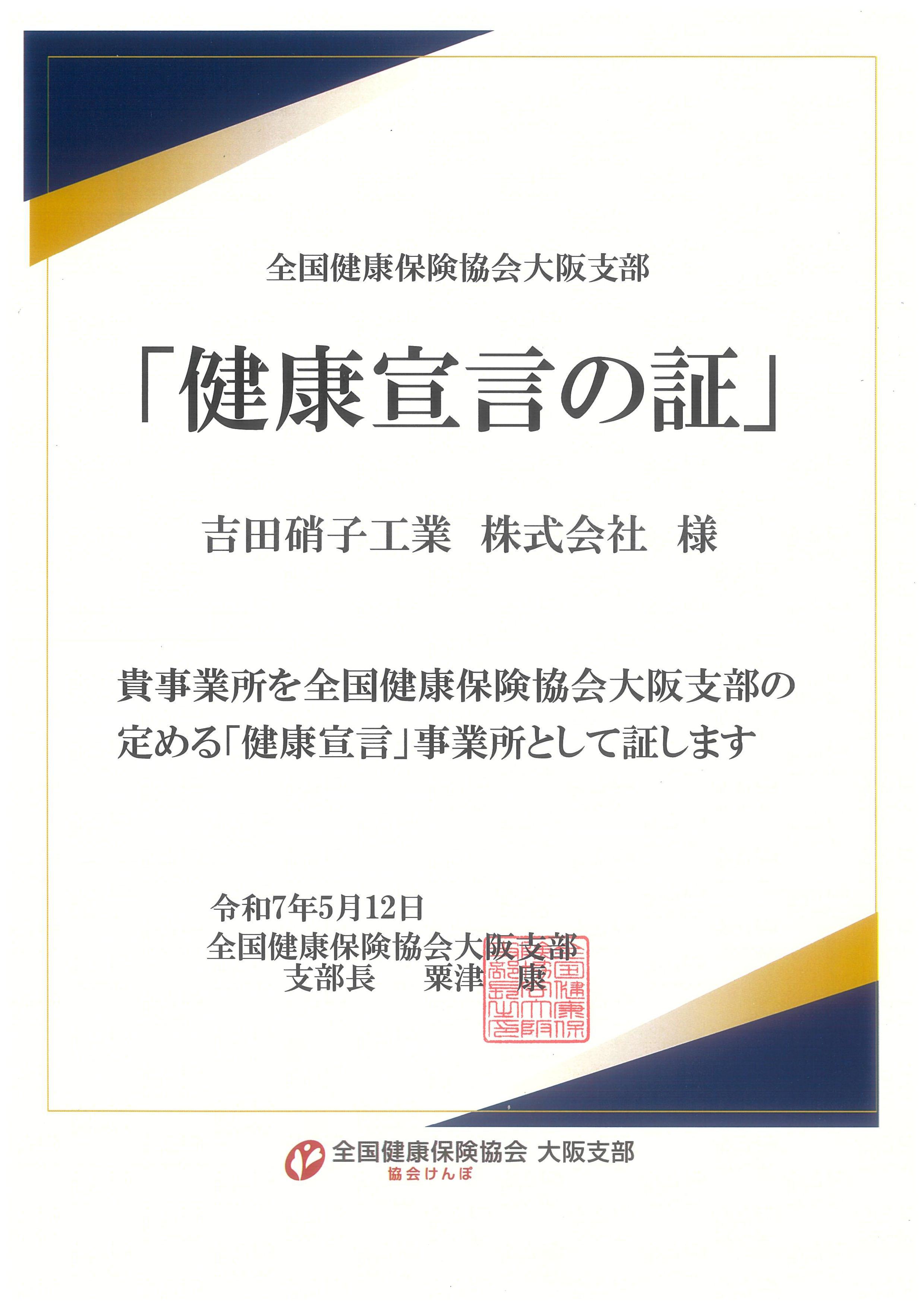 吉田硝子工業株式会社では、全国健康保険協会に「健康企業宣言」を行ない、積極的な健康経営づくりの取り組みを実施しております。